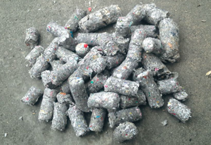 紙くず、木くず、プラスチックの破砕された廃棄物を、円柱状の固形燃料(RPF)として成形します。