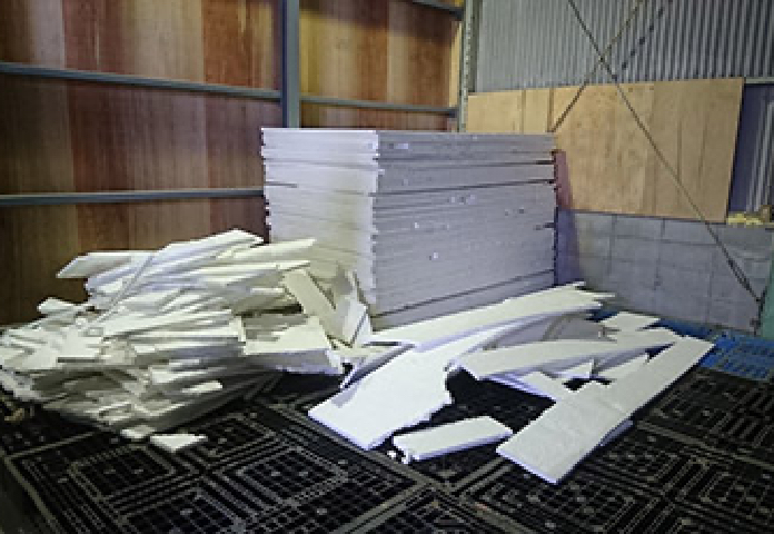 輸送、製品の緩衝剤として使われる発泡スチロールを溶かして固形状にします。