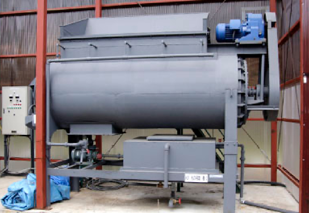 スクラバーにて生成したアンモニウムイオン水を、工場内にて発酵させた堆肥に、撹拌ミキサー内でアンモニウムイオン水を噴霧して、水分を調整し最適な肥料に仕上げる。